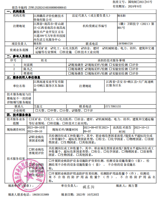 下一篇:《江西高速实业开发有限公司峡江服务区西加油站工作场所职业病危害因素检测报告》(报告编号:GCJC-23-152-20)