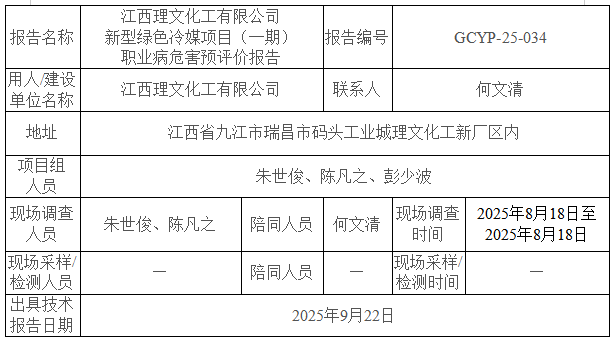江西理文化工有限公司 新型绿色冷媒项目(一期) 职业病危害预评价报告