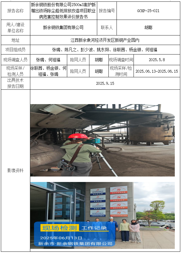 新余钢铁股份有限公司2500m3高炉新增出铁场除尘超低排放改造项目职业病危害控制效果评价报告书