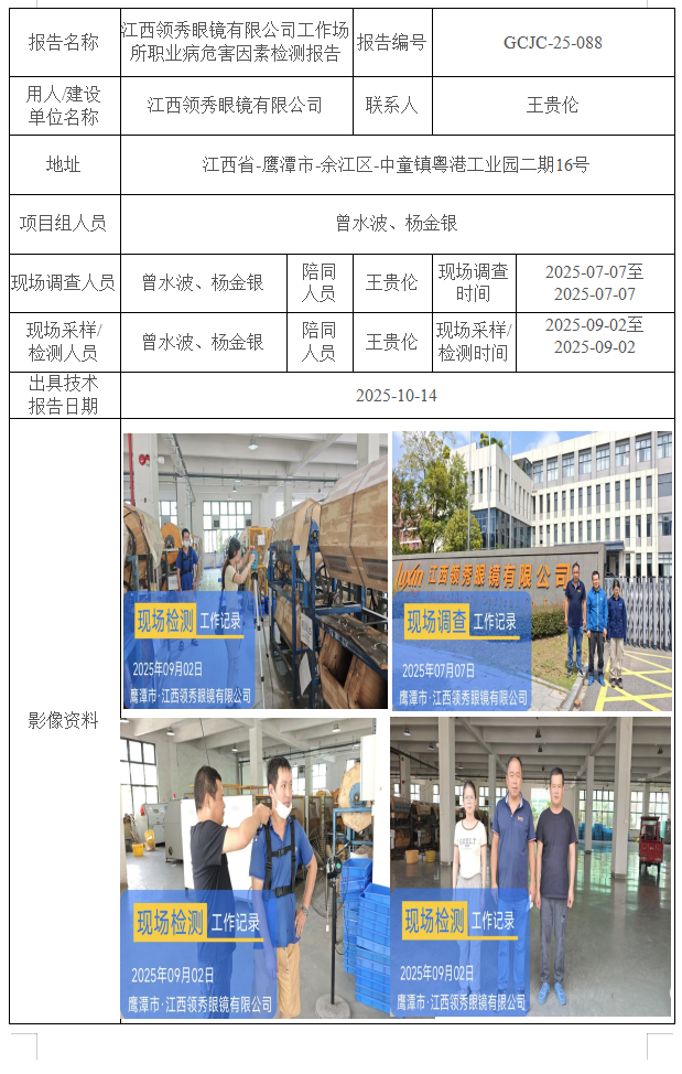 江西领秀眼镜有限公司工作场所职业病危害因素检测报告