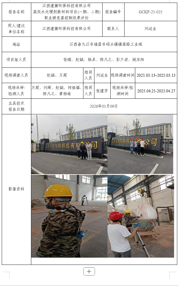 江西建衡环保科技有限公司 高效水处理剂新材料项目(一期、二期) 职业病危害控制效果评价