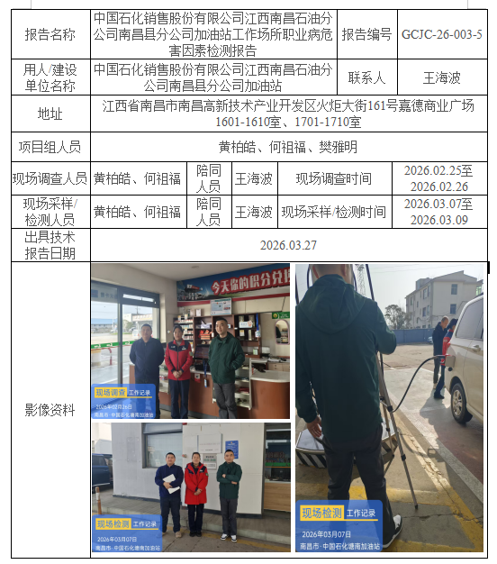 中国石化销售股份有限公司江西南昌石油分公司南昌县分公司加油站工作场所职业病危害因素检测报告