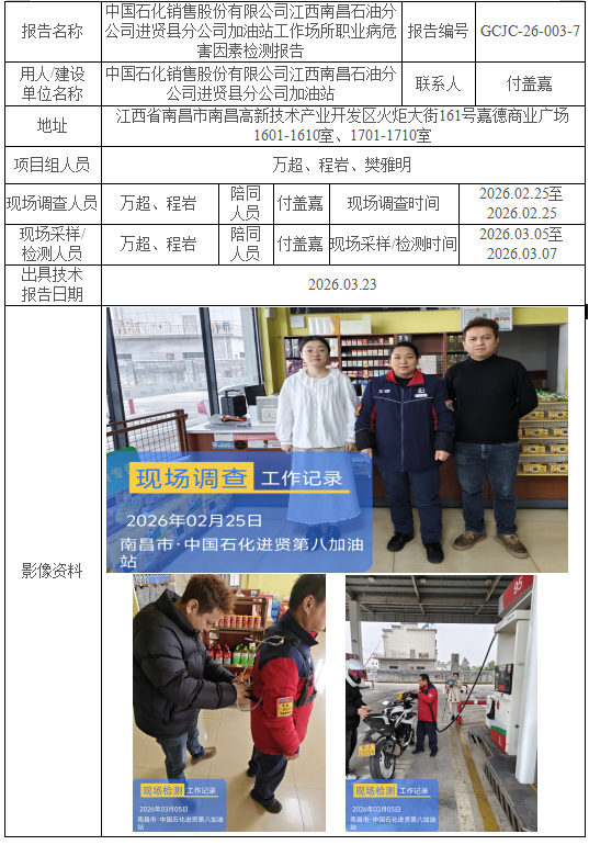 中国石化销售股份有限公司江西南昌石油分公司进贤县分公司加油站工作场所职业病危害因素检测报告