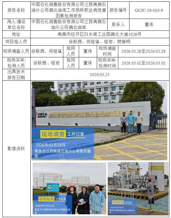 中国石化销售股份有限公司江西南昌石油分公司昌北油库工作场所职业病危害因素检测报告