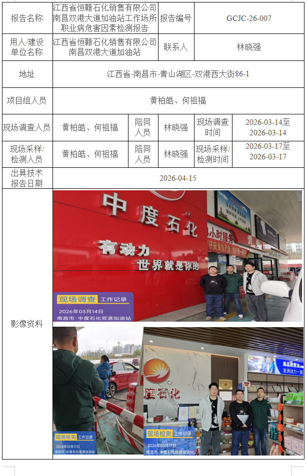 江西省恒赣石化销售有限公司南昌双港大道加油站工作场所职业病危害因素检测报告