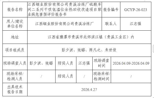 江西铜业股份有限公司贵溪冶炼厂硫酸车间二系列干吸低温位余热回收改造项目职业病危害预评价报告书
