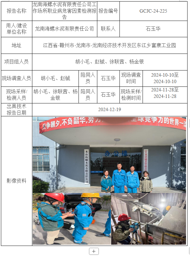 龙南海螺水泥有限责任公司工作场所职业病危害因素检测报告