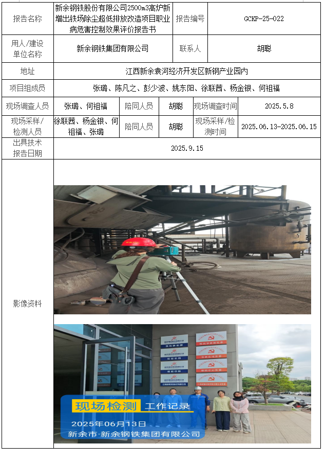 新余钢铁股份有限公司2500m3高炉新增出铁场除尘超低排放改造项目职业病危害控制效果评价报告书