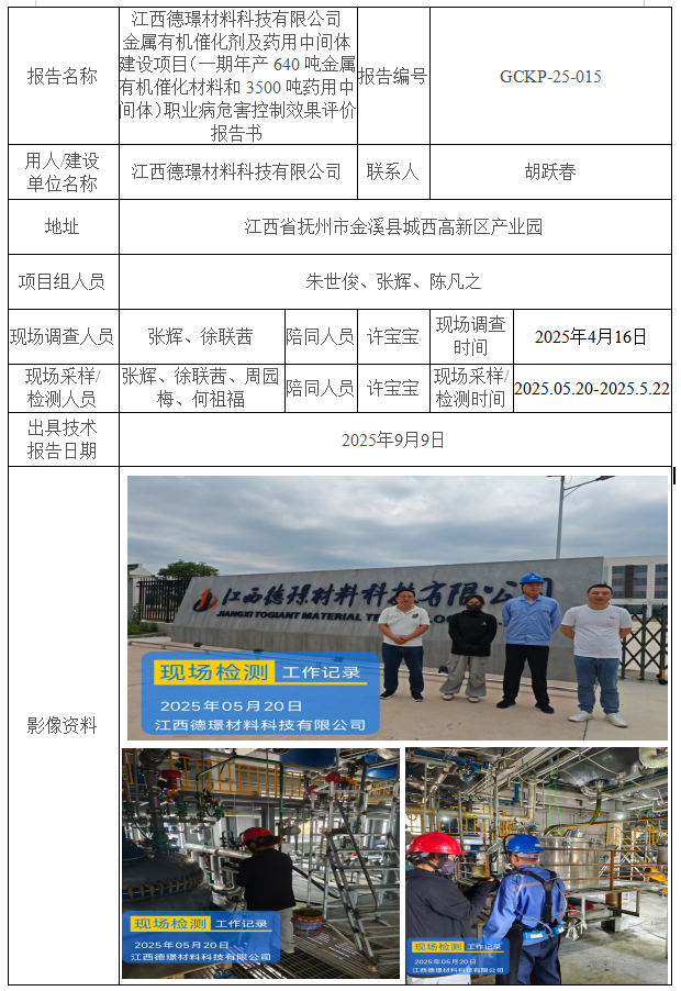 江西德璟材料科技有限公司 金属有机催化剂及药用中间体建设项目(一期年产640吨金属有机催化材料和3500吨药用中间体)职业病危害控制效果评价报告书