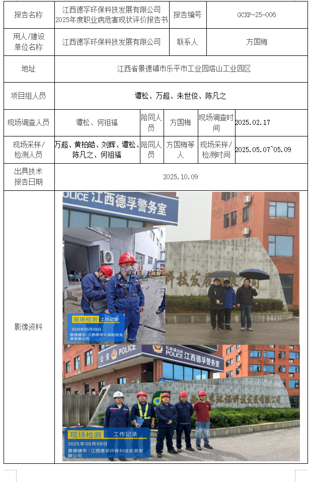 江西德孚环保科技发展有限公司 2025年度职业病危害现状评价报告书