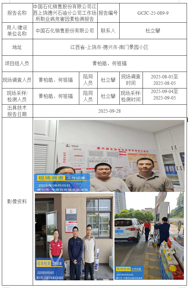 中国石化销售股份有限公司江西上饶德兴石油分公司工作场所职业病危害因素检测报告