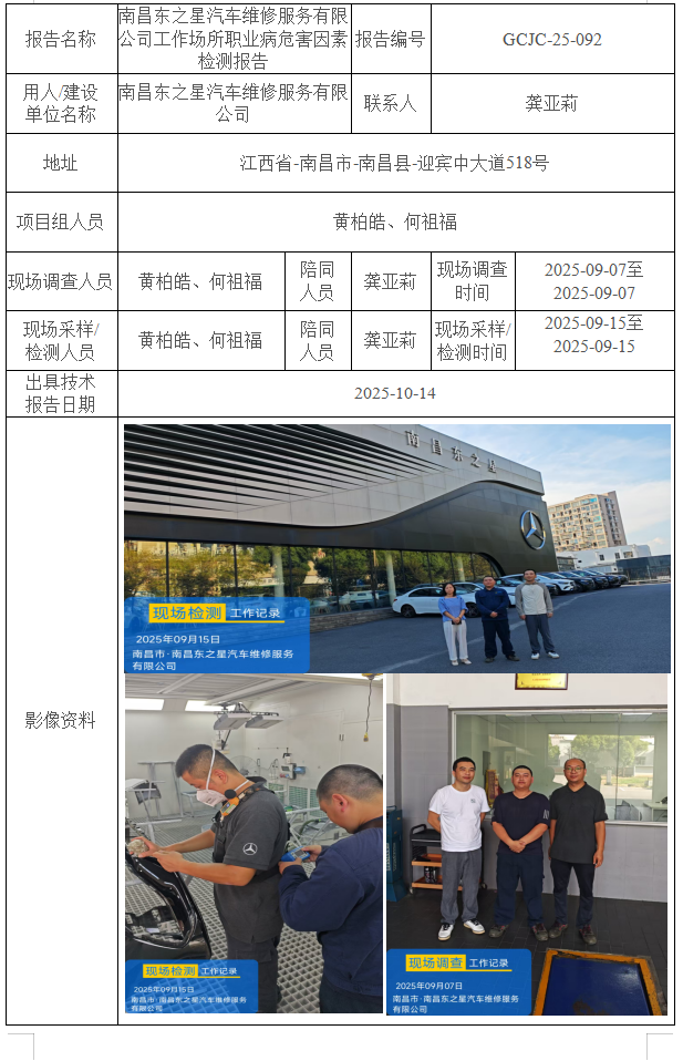 南昌东之星汽车维修服务有限公司工作场所职业病危害因素检测报告