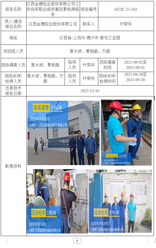 江西金德铅业股份有限公司工作场所职业病危害因素检测报告