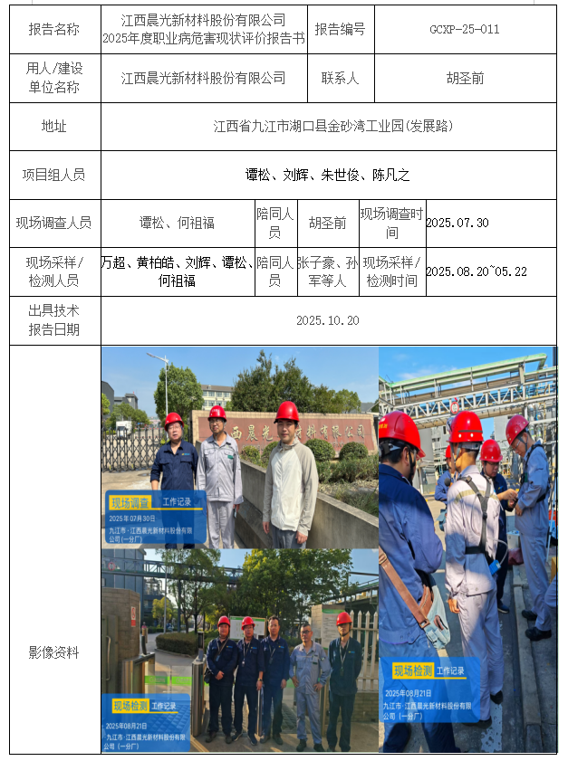 江西晨光新材料股份有限公司 2025年度职业病危害现状评价报告书