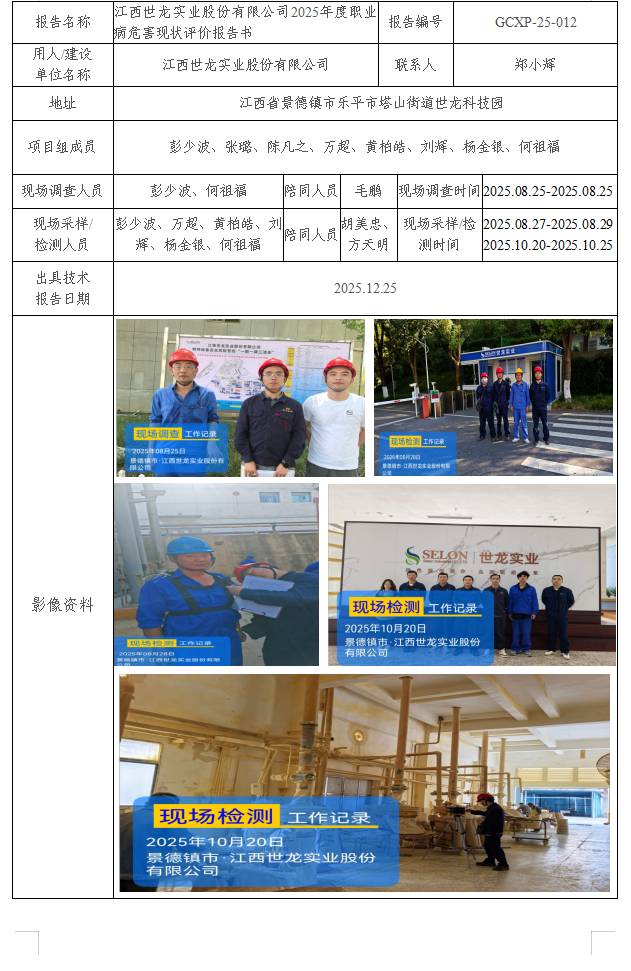 江西世龙实业股份有限公司职业病危害现状评价报告书