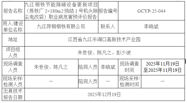 九江钢铁节能降碳设备更新项目(炼铁厂2×180m2烧结1号机头除尘电改袋)职业病危害预评价报告