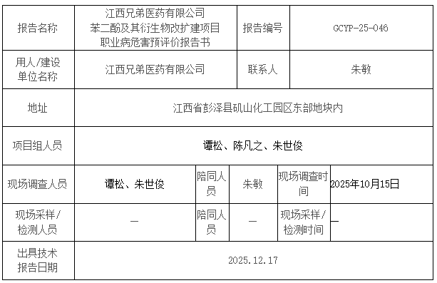 江西兄弟医药有限公司 苯二酚及其衍生物改扩建项目 职业病危害预评价报告书