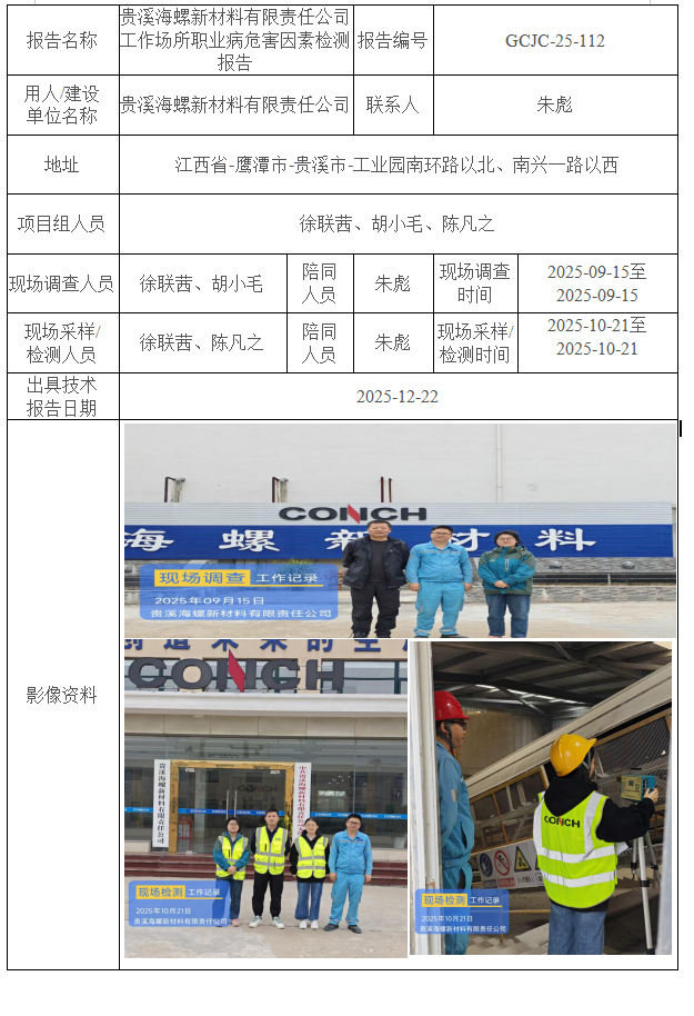贵溪海螺新材料有限责任公司工作场所职业病危害因素检测报告