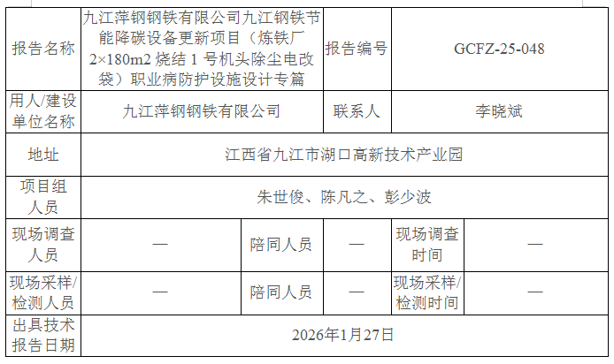 九江萍钢钢铁有限公司九江钢铁节能降碳设备更新项目(炼铁厂2×180m2烧结1号机头除尘电改袋)职业病防护设施设计专篇