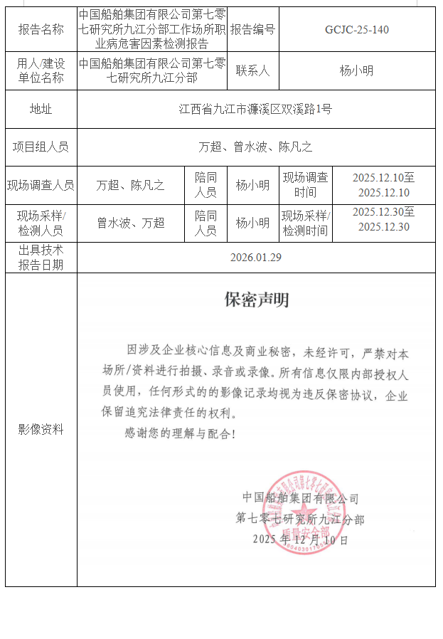 中国船舶集团有限公司第七零七研究所九江分部工作场所职业病危害因素检测报告